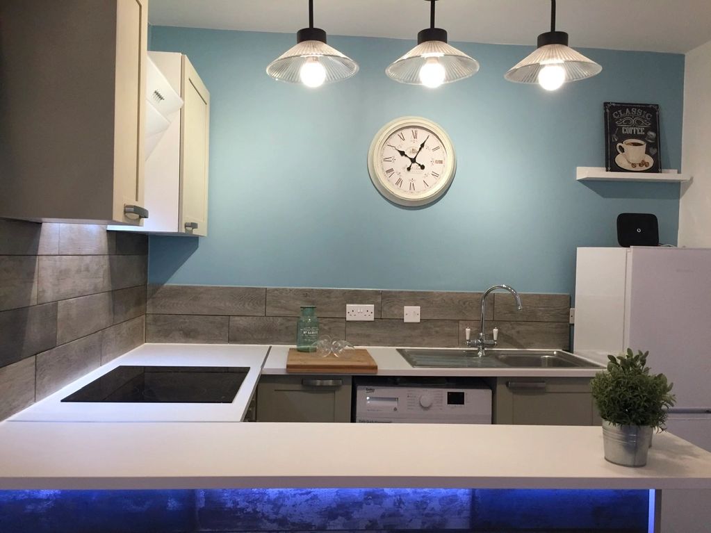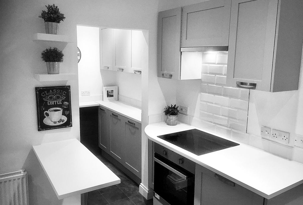 Kitchen and dining with additional worktop bar to provide subtle seperation.